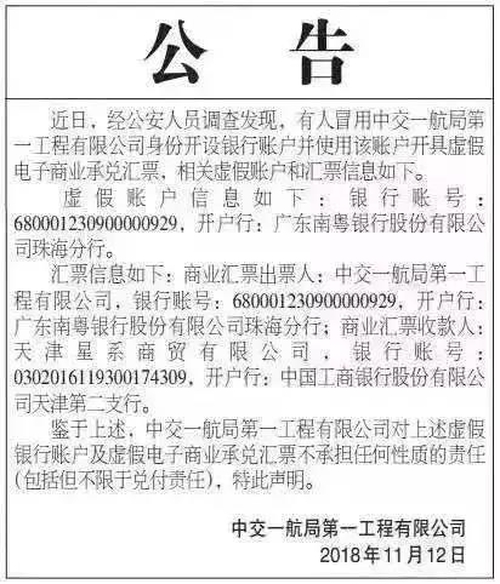 近日中鐵二局集團(tuán)有限公司緊急發(fā)布公告稱,近期票據(jù)市場上出現(xiàn)興業(yè)銀行長春前進(jìn)大街支行,以中鐵二局集團(tuán)有限公司名義出具的電子商業(yè)承兌匯票,這批電子商業(yè)承兌匯票出票人為“中鐵二局集團(tuán)有限公司”,開戶行為“興業(yè)銀行長春前進(jìn)大街支行”。興業(yè)銀行長春前進(jìn)大街支行不是中鐵二局集團(tuán)有限公司的合作銀行,該商業(yè)承兌匯票不是中鐵二局集團(tuán)有限公司出具。